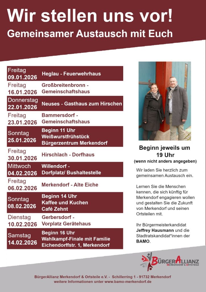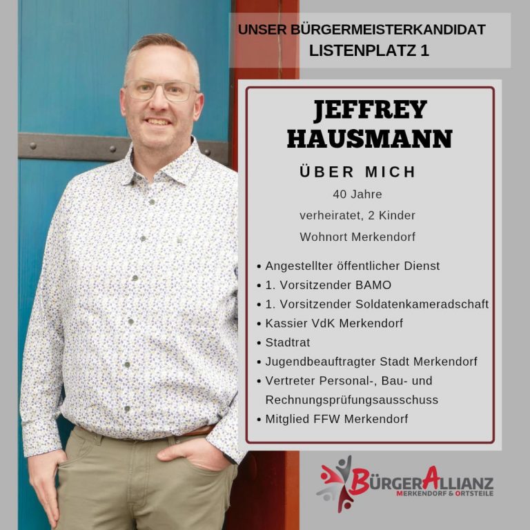 Bei der Jahresversammlung der BAMO haben wir auch die ersten Weichen für die Kommunalwahlen 2026 gestellt. Mit Jeffrey Hausmann gehen wir als Bürgermeisterkandidat in die Wahl. Denn Merkendorf hat mehr verdient, als ewige Diskussionen und Stillstand. Der gewählte Vorstand im Einzelnen: 1. Vorsitzender Jeffrey Hausmann 2. Vorsitzende Marie Behringer 3. Vorsitzender Ulrich Philipp Schriftführer Martin Huber Kassier Sascha Meier Beisitzerinnen Carmen Paschke, Laura Kistner Kassenprüfer Georg Barth, Matthias Gilles Pressesprecher Daniel Ammon.
